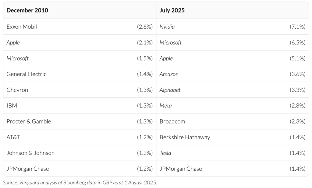 But if we rewind to the end of 2010, the picture was dramatically different. At that time, companies like Exxon Mobil, General Electric, and Chevron were among the top 10 largest holdings in the index. Of today’s Magnificent 7, only Apple and Microsoft were in the top 10. The landscape of market leadership had shifted profoundly.